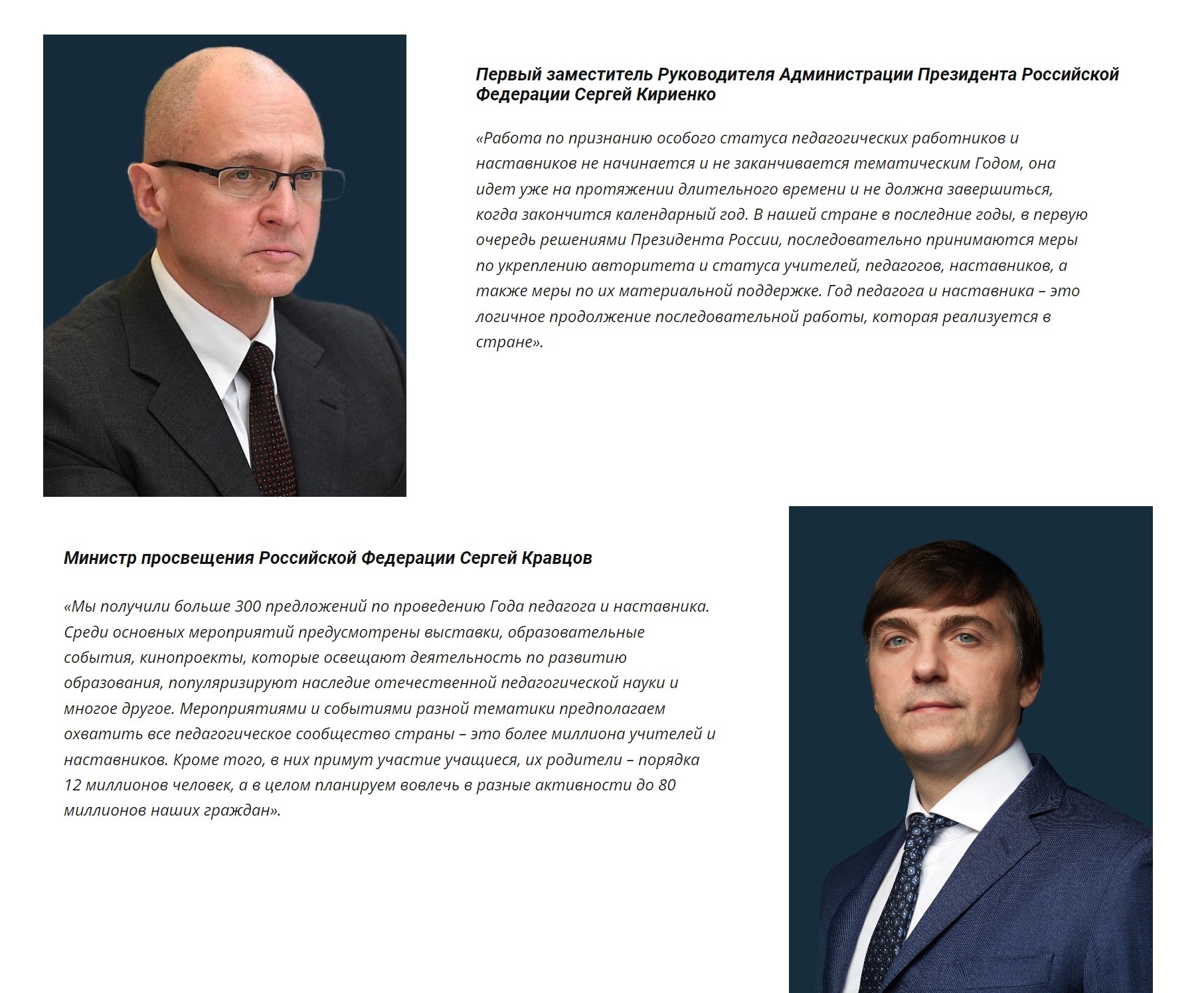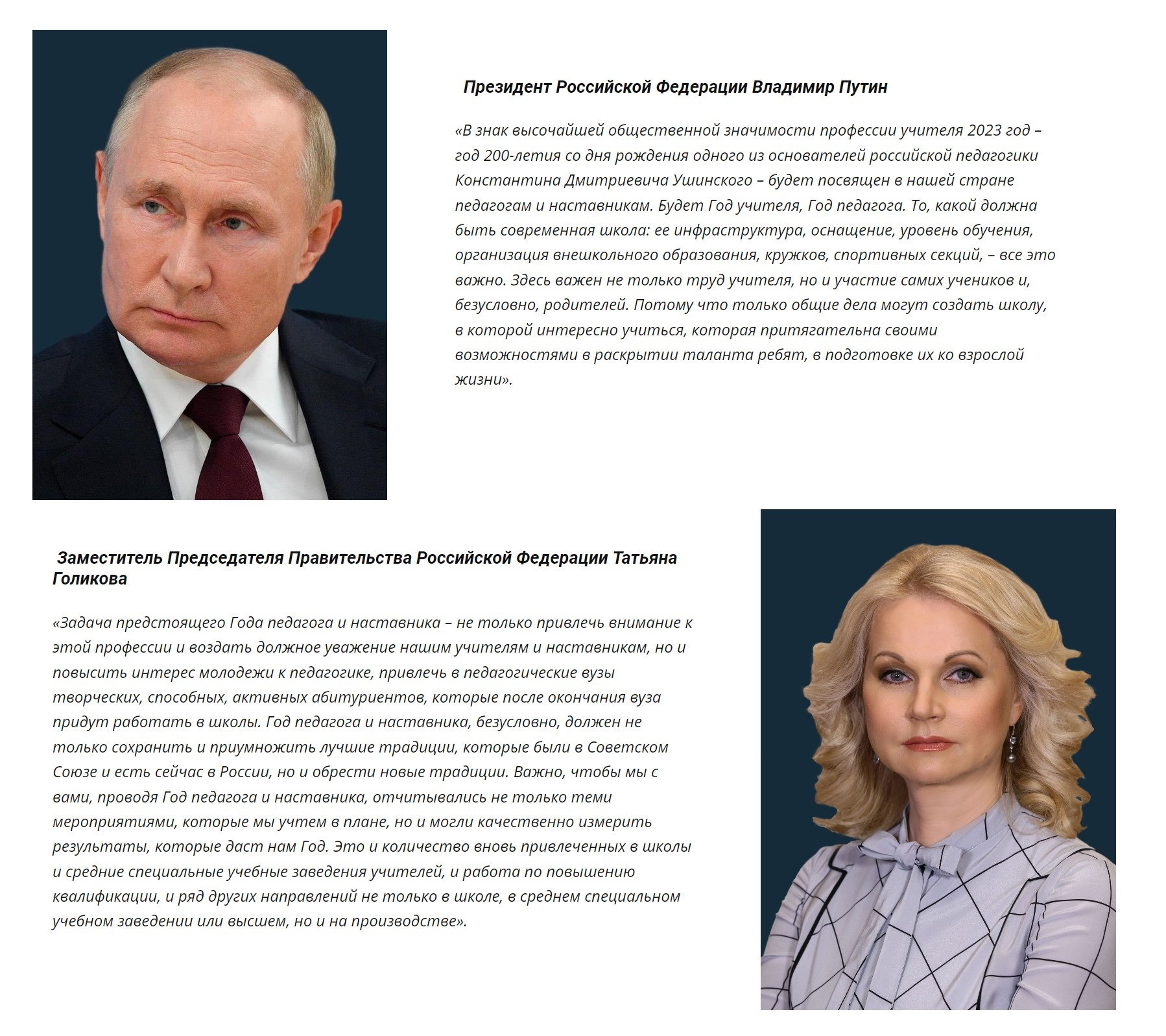 2023 год Указом Президента России Владимира Путина объявлен Годом педагога и наставника. Миссия Года – признание особого статуса педагогических работников, в том числе выполняющих наставническую деятельность. Мероприятия Года педагога и наставника будут направлены на повышение престижа профессии учителя.