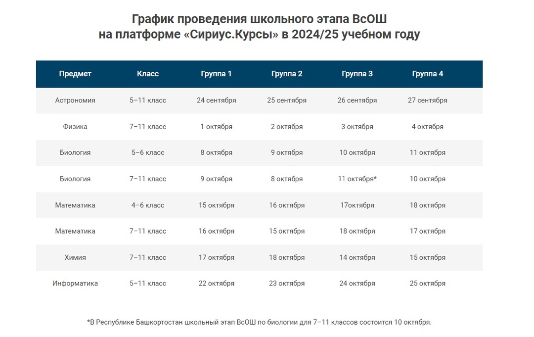 29.08.2024Опубликован График проведения школьного этапа ВсОШ на платформе «Сириус.Курсы» в 2024/25 учебном году: https://siriusolymp.ru/about#schedule Школьный этап пройдет с 24 сентября по 25 октября 2024 года.