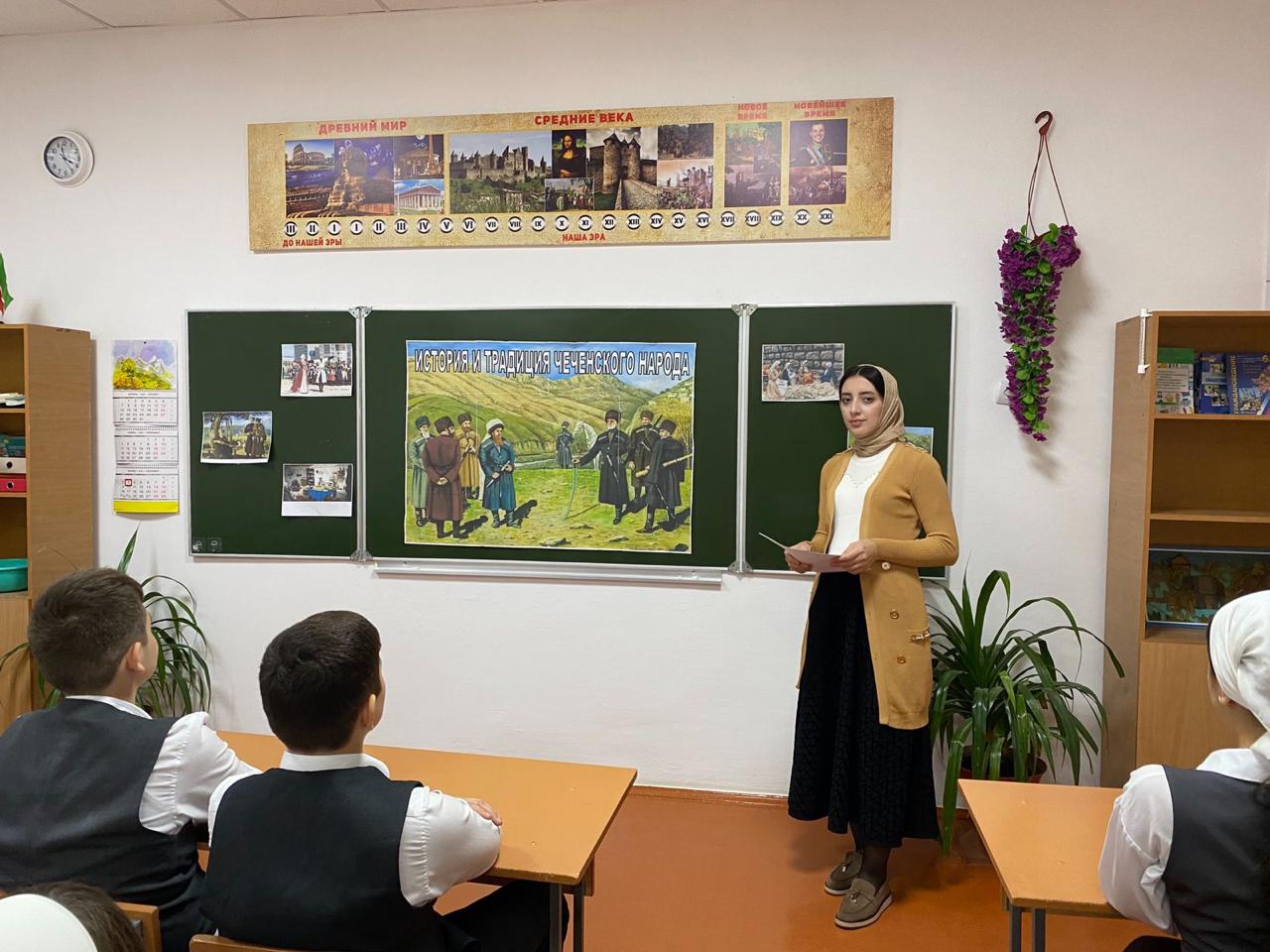 09.12.2024Тематический урок: История и культура Чеченской Республики 9 декабря 2024 года Тарлаева Х.М., учитель истории и обществознания в для обучающихся 7-х классов провела тематический урок «История и культура ЧР», посвященный Году истории, исторических памятников, архитектуры и культурного наследия чеченского народа. В ходе урока Хадижат Мовладиевна рассказала обучающимся о различных аспектах истории и культуры региона, включая фольклорные традиции, кулинарные особенности, танцы, музыку и искусство ЧР. Ребята поговорили о богатом историческом и культурном наследии чеченского народа, поделились ценными мыслями о насущных проблемах и перспективах развития национальной истории и культуры. В завершении урока Хадижат Мовладиевна затронула актуальные вопросы сохранения памятников истории, пропаганды национальных традиций, а также о важности вовлечения молодежи в процесс изучения и сохранения наследия.