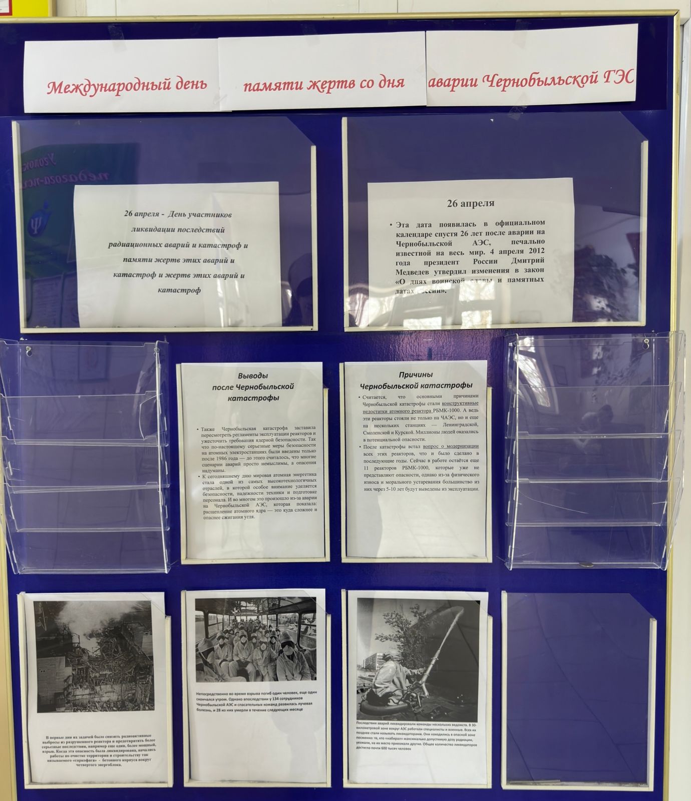 25.12.202426 апреля 2026 года исполняется 40 лет со дня аварии на Чернобыльской атомной электростанции. Этот трагический день в истории объявлен Международными днём памяти жертв радиационных аварий и катастроф. Библиотекарем школы оформлен информационный стенд, посвящённый этой трагической дате.