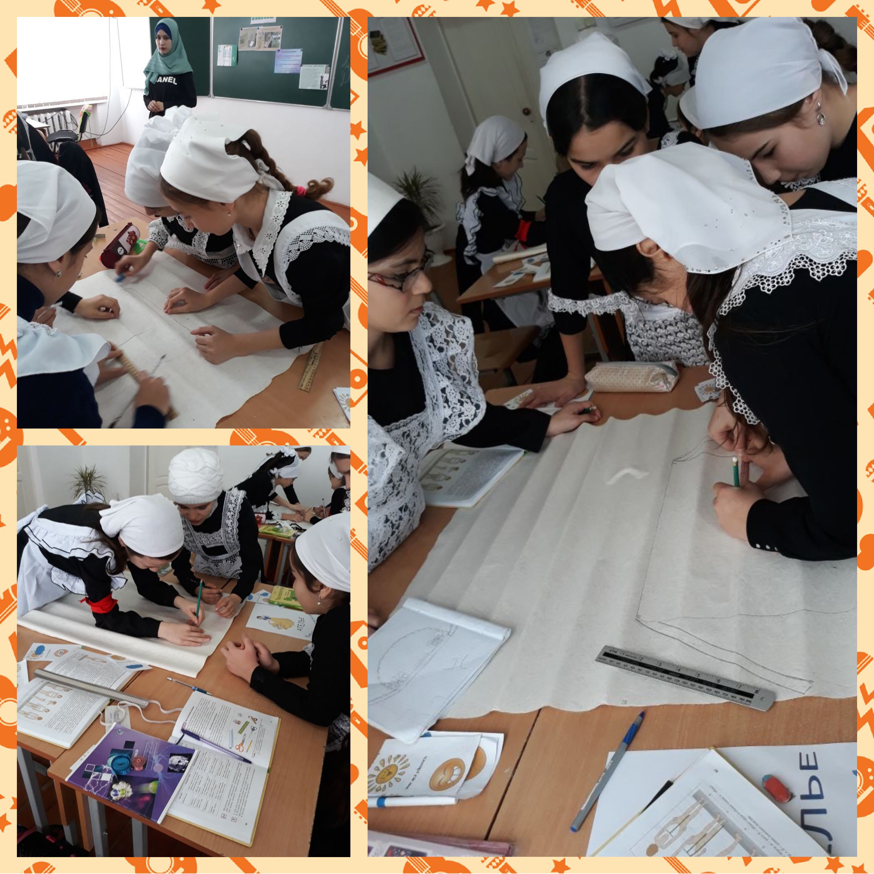 Трудовое обучение в 5б классе (девочки). Учитель Исраилова Жанетта Алиевна. Тема урока: "Швейное изделие для кухни. Снятие мерок и изготовление выкройки фартука". Ученицы готовятся к защите проектов, работают в группах "Белоснежка", "Золушка", "Минни".