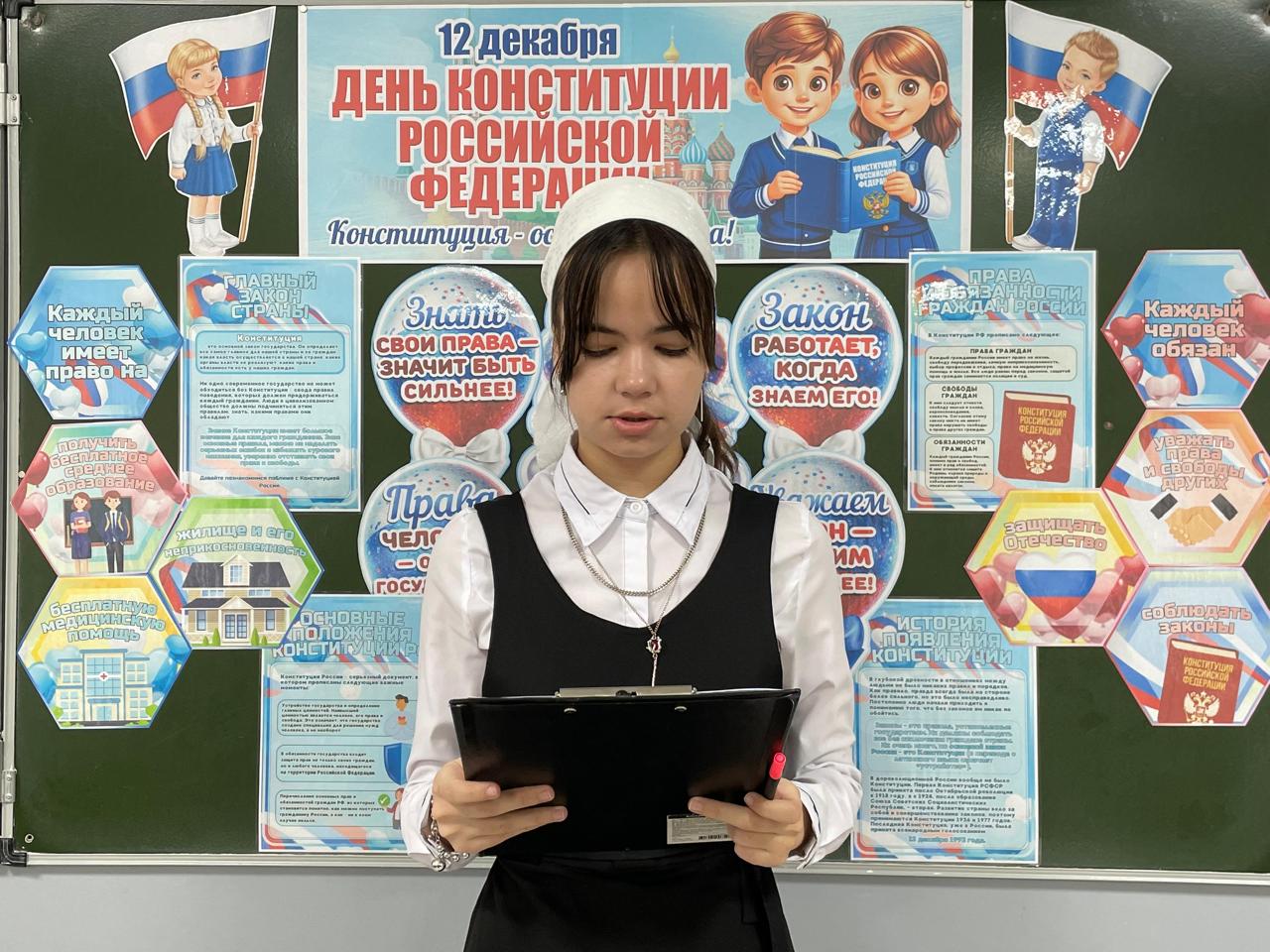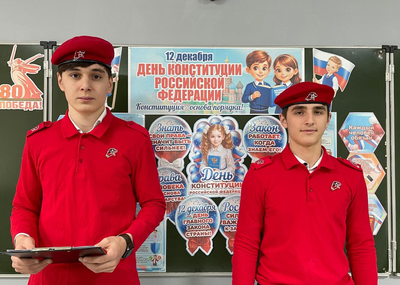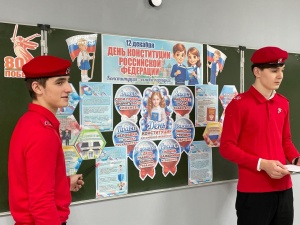11 декабря Юнармейцы МБОУ «СОШ № 3 г.Шелковская» с целью привлечения внимания учащихся к знанию основ права и гражданской ответственности, воспитания уважения к Основным законам Российской Федерации, среди обучающихся 9-х классов провели беседу, направленную на разъяснение исторических аспектов и юридической значимости Дня Конституции Российской Федерации.