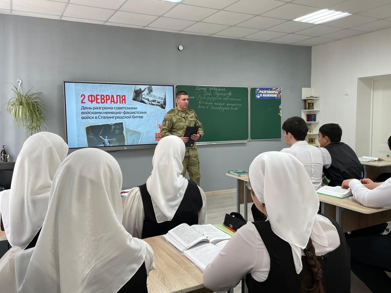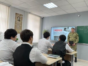 В рамках мероприятий, посвящённых героическим событиям Великой Отечественной войны, военнослужащий войсковой части №6499 войск Национальной гвардии Российской Федерации, старший лейтенант Михаил Черванёв провёл для обучающихся 10-А класса урок мужества на тему «2 февраля — День разгрома советскими войсками немецко-фашистских войск в Сталинградской битве».
